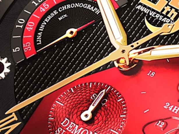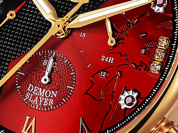 2、4、8、10時位置にはリナが身に着けているタリスマン「魔血玉(デモン・ブラッド)」をイメージした金属装飾を配置し、12時位置にはゴールドで35周年記念ロゴと、3時位置には天然ダイヤ3石をあしらっている。秒針は伝説の剣「斬妖剣(ブラストソード)」の形になっている点も注目だ。