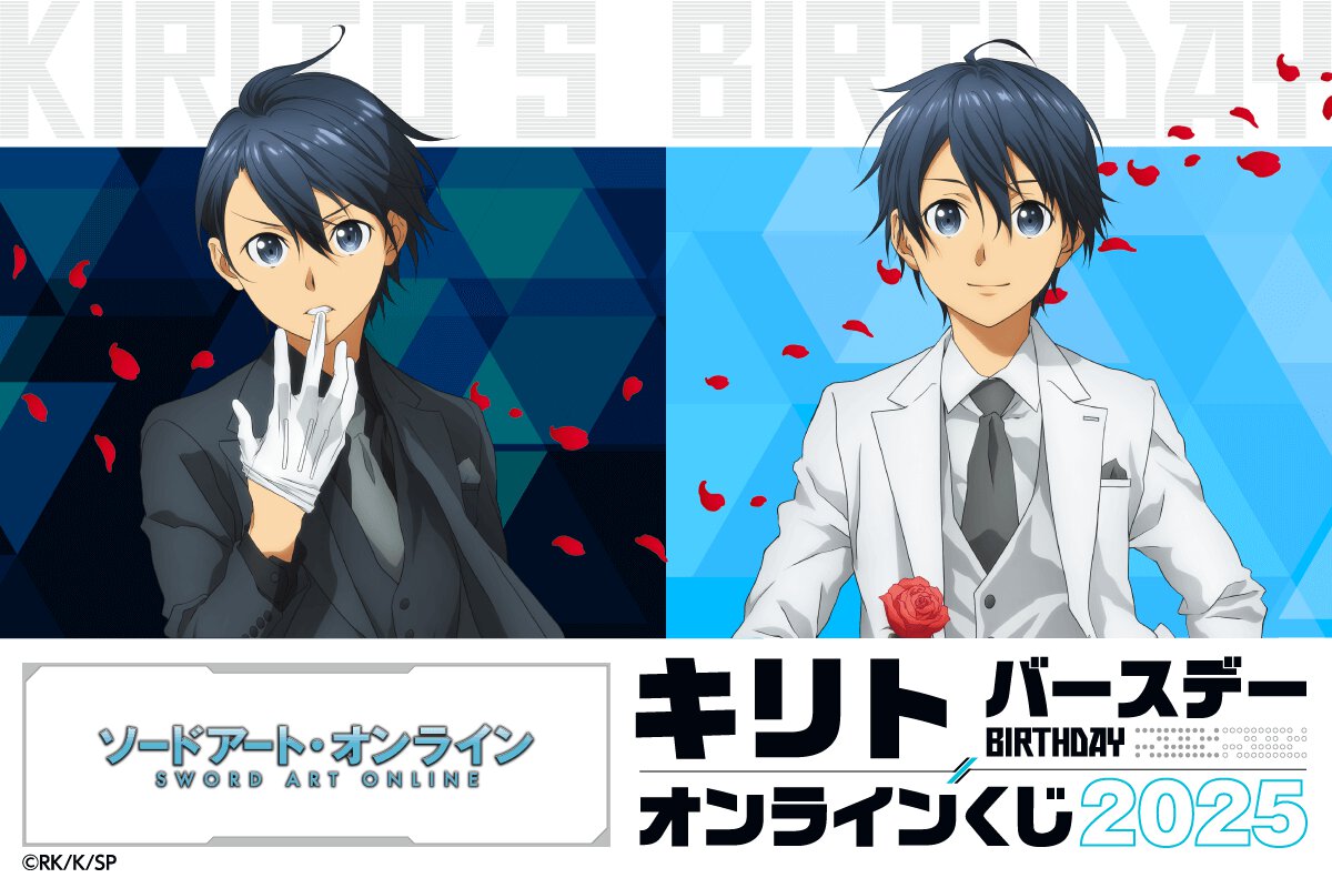 10月7日の誕生日を記念したこのオンラインくじでは、ドレスアップしたキリトの描き下ろしイラストを使ったアクリルフィギュアやタペストリーなどを用意。販売価格は1回770円(税込※別途発送手数料)で、販売期間は2025年10月7日(火)12:00〜2025年11月4日(火)11:59。