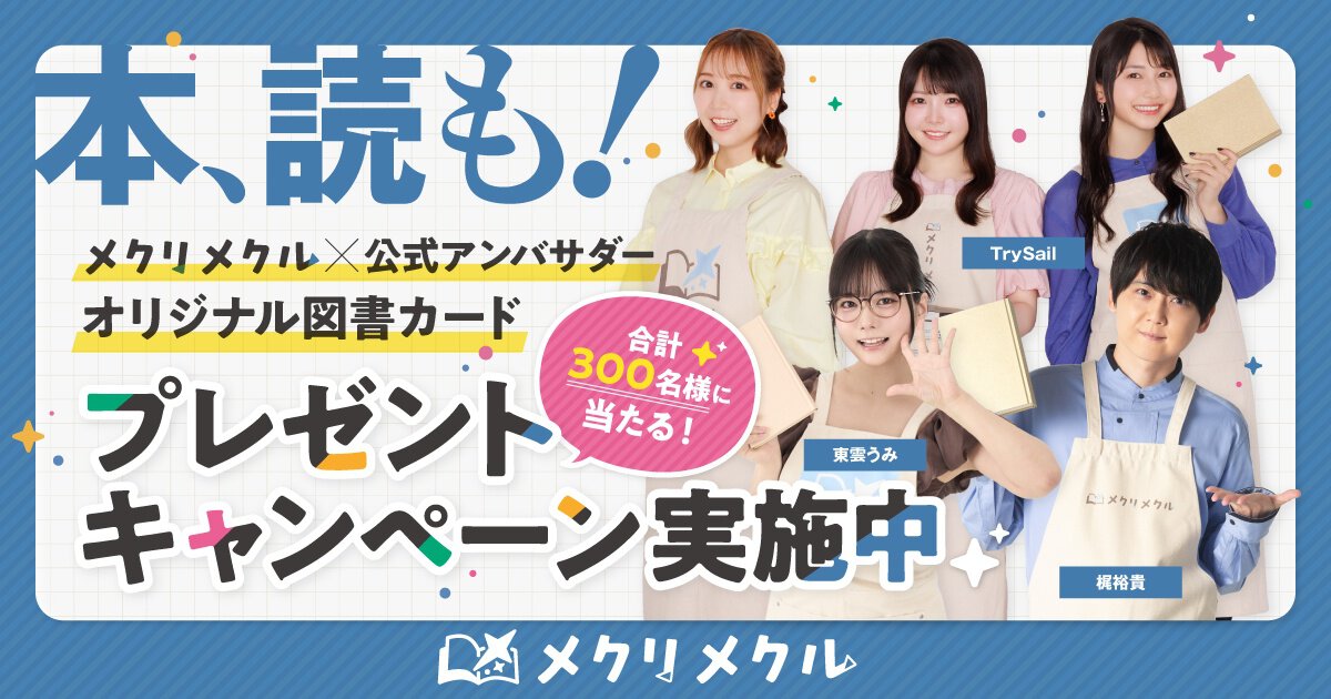 ということで、メクリメクルの公式アンバサダーをお勤めいただいている東雲うみさん、Trysailのみなさん、そして梶裕貴さんのオリジナル図書カード1000円分をそれぞれ100名様、計300名様にプレゼントする大キャンペーンを実施します!