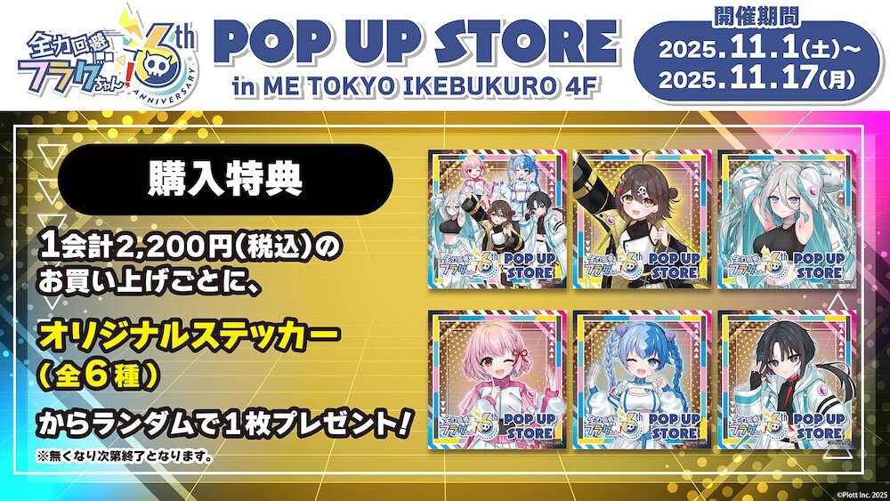 YouTubeチャンネル登録者数230万人超の人気ショートアニメ『全力回避フラグちゃん!』が6周年を迎え、記念のポップアップストアが東京・池袋のME TOKYO IKEBUKUROで2025年11月1日(土)より開催中。6周年オリジナルイラストを使用したグッズが販売されるほか、フォトスポットエリアや等身大パネルの設置と、このポップアップストアでしか聞けない店内放送アナウンスが用意されている。