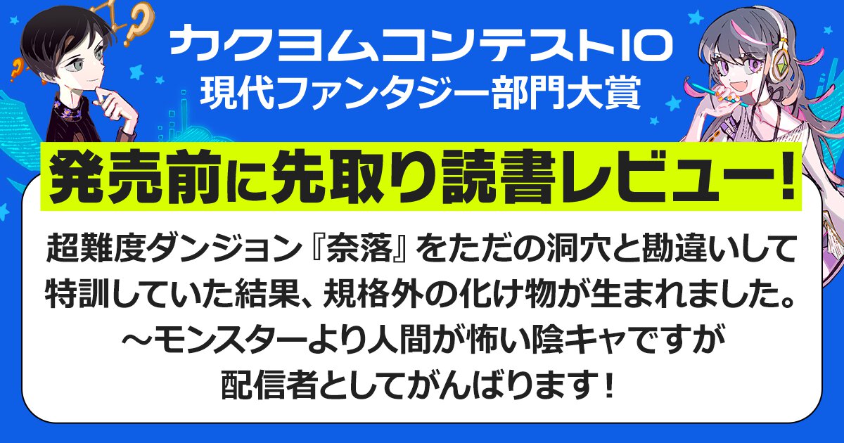本作は今のラノベ業界でトレンドにもなっている、いわゆる「現代ダンジョン配信」系の現代ファンタジーなんですが、このジャンルで個人的に一番重要だと感じている「主人公の個性」が素晴らしい作品でした! 主人公・楢木野ラクナ──通称「奈落ちゃん」は、筋金入りのコミュ弱少女。人とうまく会話ができず、ダンジョン配信でコメントを読んでは慌てまくるようなキャラクターです。そんな彼女の挙動不審と言ってもいいくらいのドタバタっぷりと、バトルでのバーサーカーっぷりのギャップが最高に面白い! 無自覚最強×コミュ弱ヒロインというキャラクター性が、めちゃくちゃクセになります。