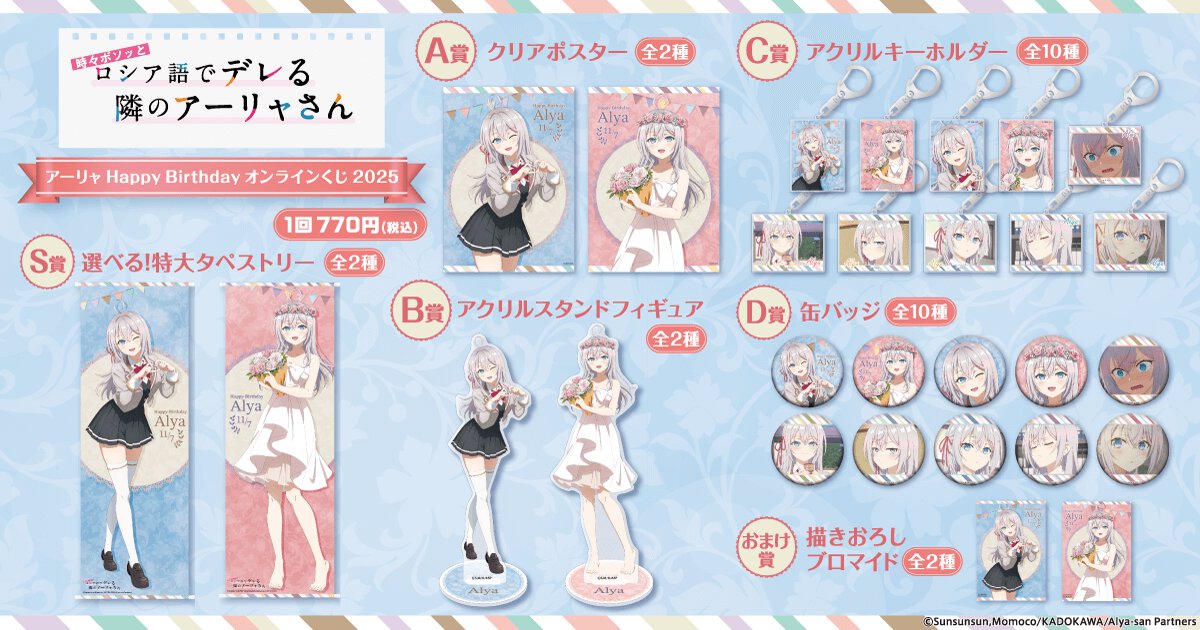 このたび販売されるくじは、11月7日のアーリャの誕生日を記念したもので、新規描き下ろイラストなどを使った特大タペストリーやアクリルスタンドフィギュアといった多数のアイテムを用意。販売期間は2025年11月7日(金)17:00~2025年11月27日(木)16:59で、価格は1回770円(税込、別途発送手数料)。