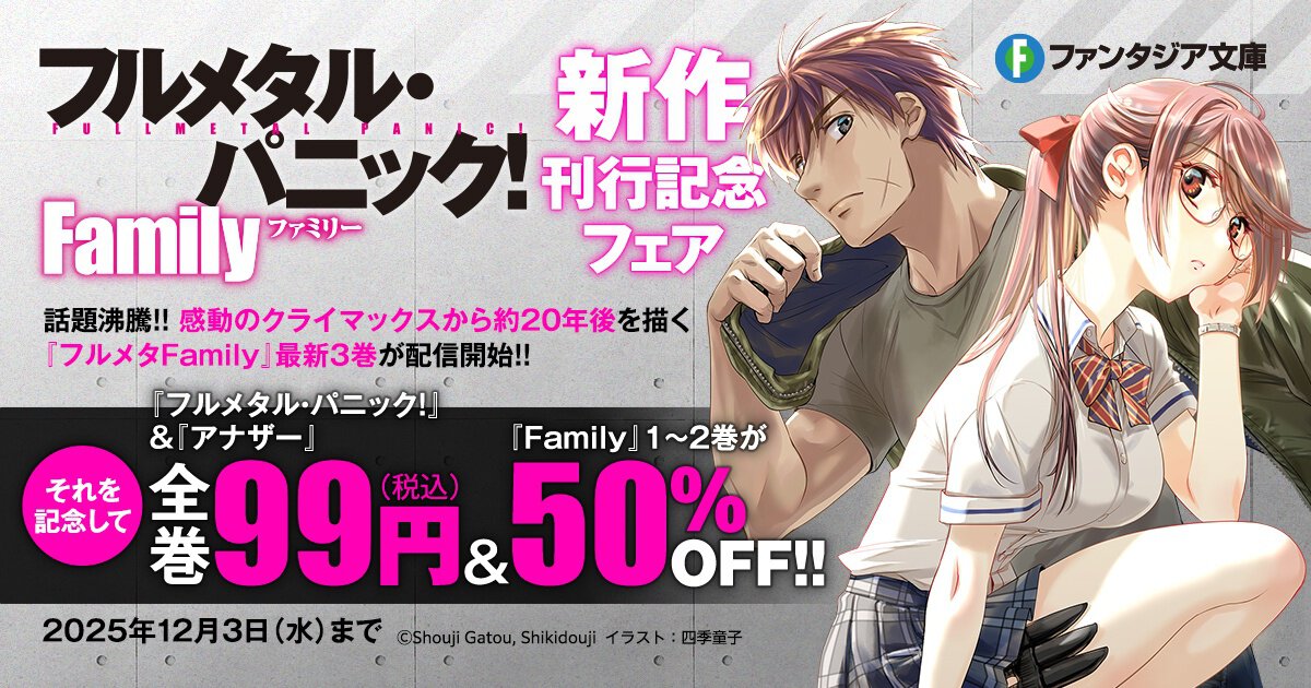 ファンタジア文庫『フルメタル・パニック Family」』の第3巻が2025年11月に発売されたことを記念して、昨年大好評だった関連作品をお得な価格で楽しめるフェアを今年も開催しています!