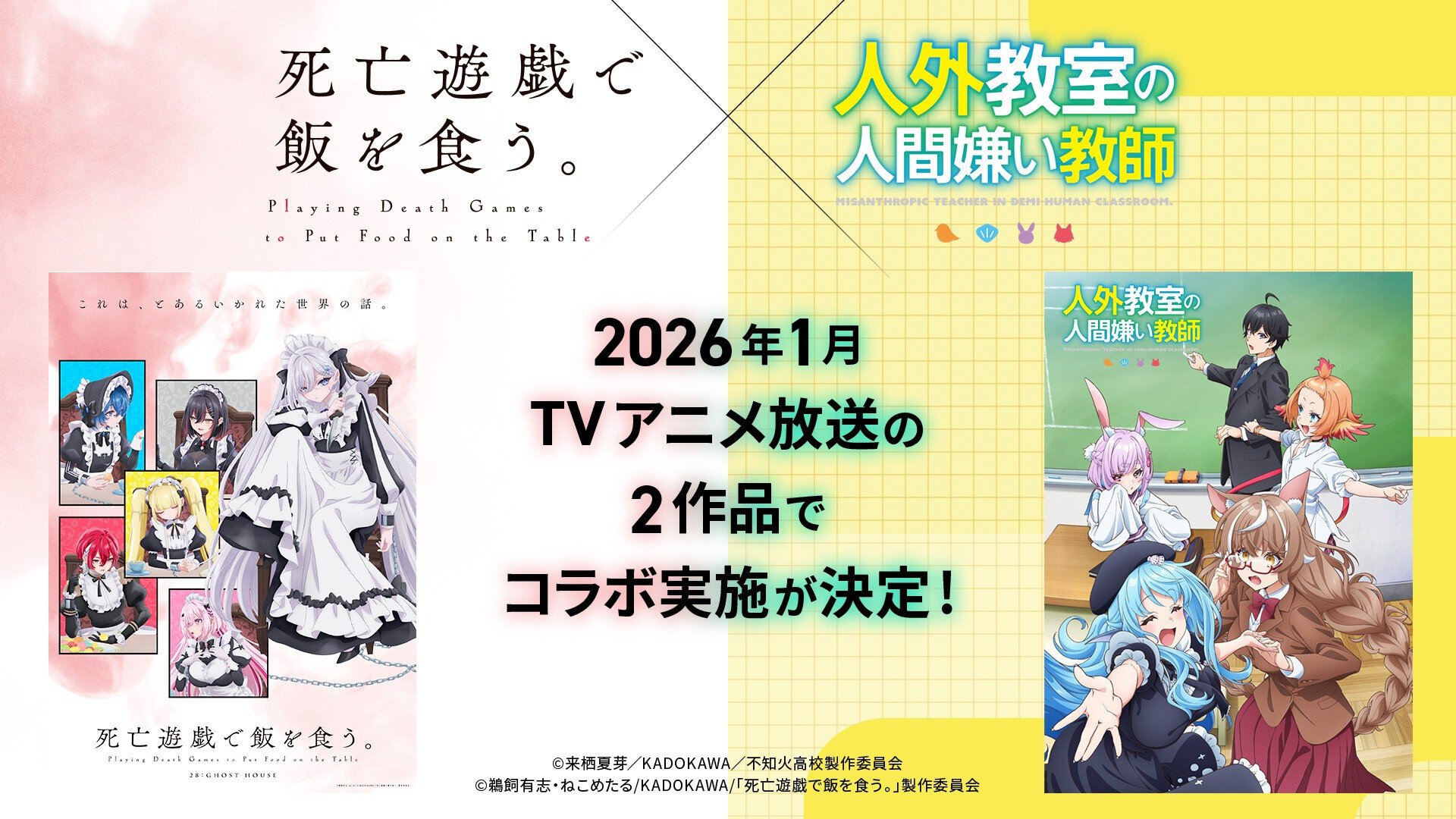 2026年1月に放送開始が控えているTVアニメ『人外教室の人間嫌い教師』。このたび、追加のキャストとOPテーマの情報が解禁に。また、同時期に放送するTVアニメ『死亡遊戯で飯を食う。』とのコラボも決定した。