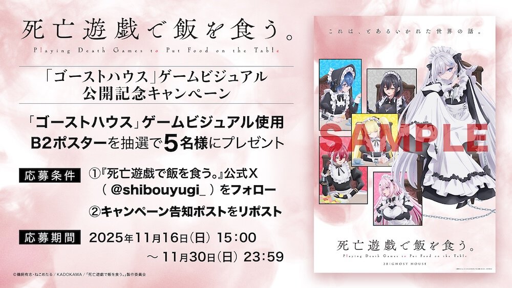 このたびのビジュアルや情報の公開を記念して、ゲームビジュアルを使ったB2ポスターを抽選で5名にプレゼントするキャンペーンを実施中だ。『死亡遊戯で飯を食う。』公式Xをフォローし、対象ポストにリポストすれば応募完了。応募受付期間は2025年11月16日(日)15:00 ~ 11月30日(日)23:59。詳細はアニメ公式サイトで確認を。