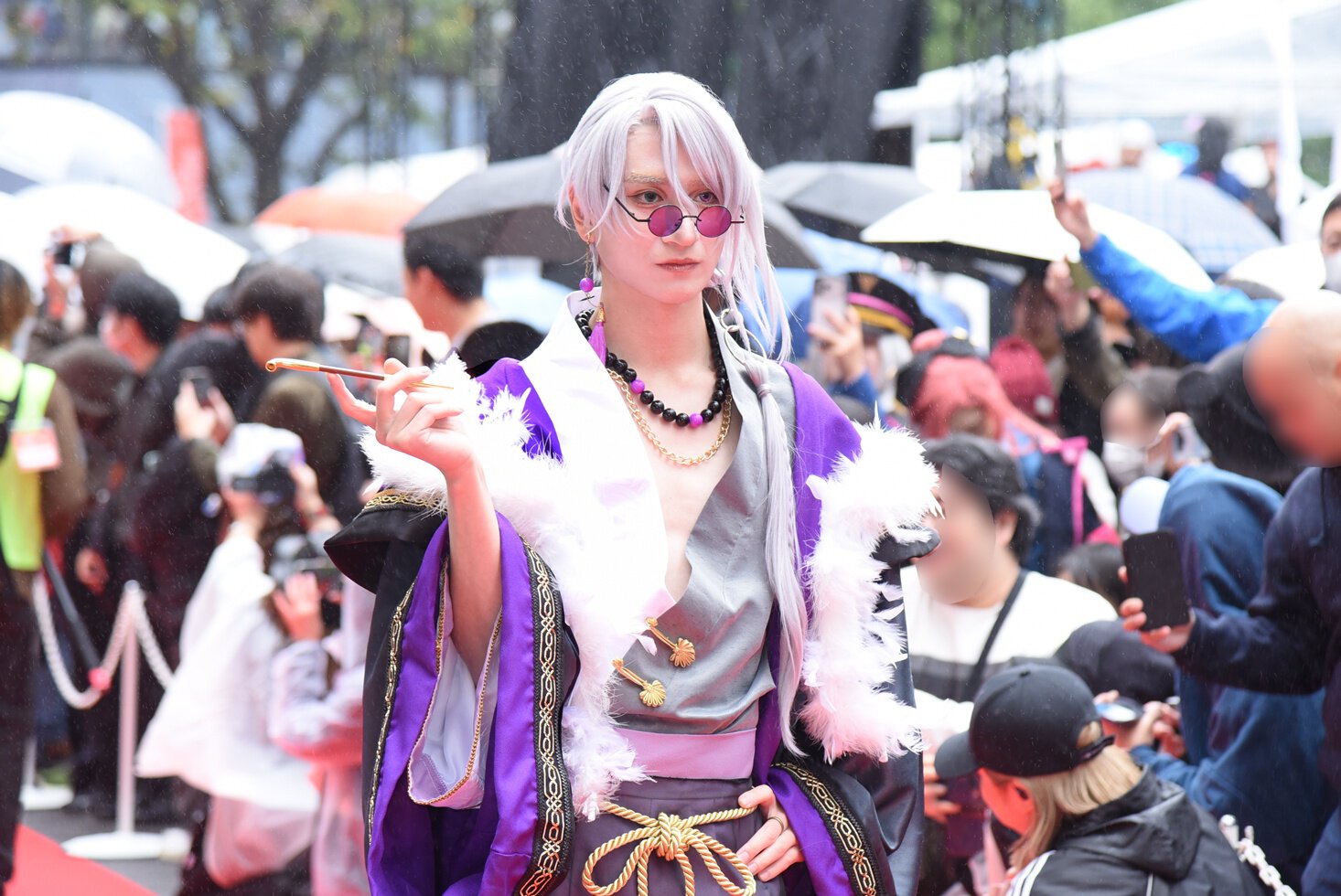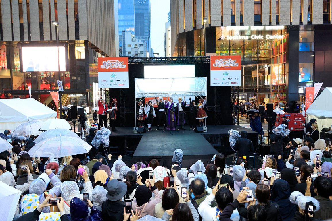 イベント初日の24日は「池ハロナイト」と称して、サンシャインシティを会場に夕方から夜にかけて開催。そのため、朝からコスプレを楽しめたのは25日から……だったのですが、今回の「池ハロ」は残念ながら両日とも雨天となってしまい、軒下などに避難しつつ、雨脚が弱まったタイミングで素早く屋外に出て、コスプレ撮影を楽しむ参加者の姿が各所で見られました。