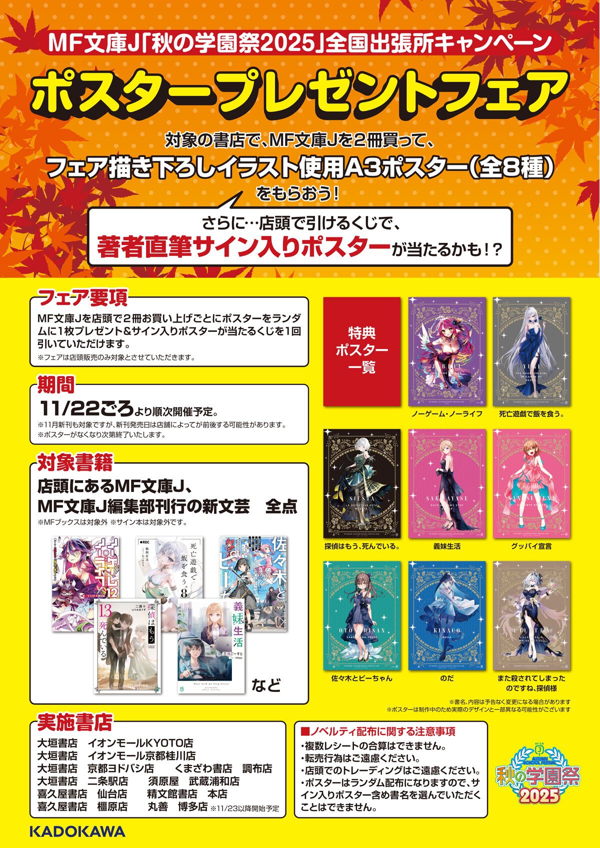 MF文庫J『秋の学園祭2025』池袋くじ引きキャンペーンのS賞景品となっている「直筆サイン入り描き下ろしイラストポスター(全8種)」が全国の一部書店でもゲットできるキャンペーンが11月22日頃より開催! 対象書店でMF文庫J作品を2冊購入ごとに、池袋くじ引きキャンペーンのS賞に使用されているものと同様のポスターをランダムで1枚プレゼント! さらに、サイン入りポスターが当たるくじを1回引くことができます。詳細はMF文庫J『秋の学園祭2025』フェアのサイトをご確認ください。